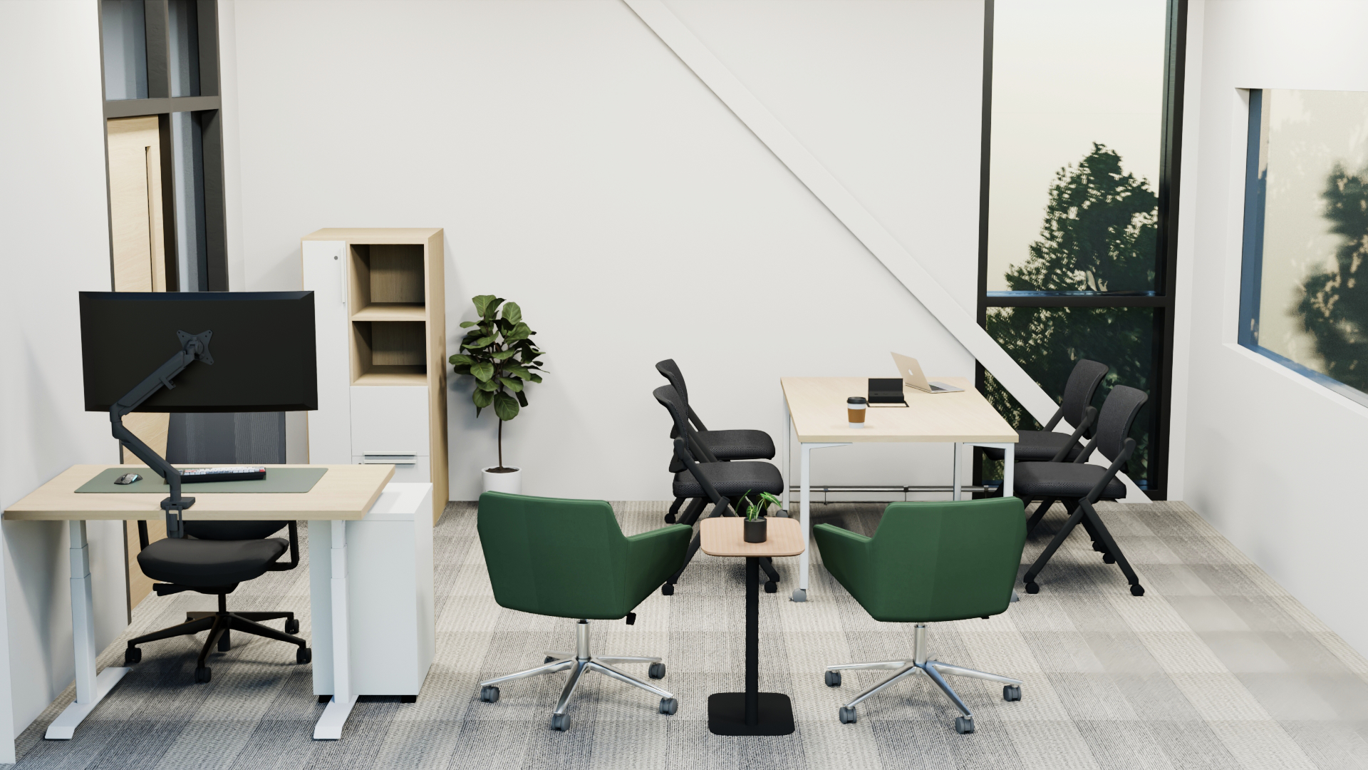 Successfully navigated multiple rounds of detailed revisions, shifting from multiple views to a single, straight-on, photorealistic angle, and incorporating fine-grain details such as a foot rail, a wall-colored K-brace, and small office accessories (monitor, etc.) for realism.